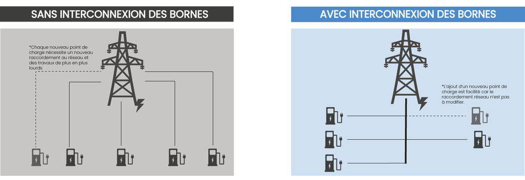 L’idée de l’interconnexion de points de charge offre alors une réponse à ce besoin d’évolutivité. Il s’agit d’utiliser des bornes qui peuvent être additionnées progressivement, de manière simple et rapide, comme des pièces de Lego. Au lieu de connecter toutes les bornes individuellement au réseau, on ne raccorde alors qu’un seul câble de grande taille au réseau et on y relie chaque point de charge.
